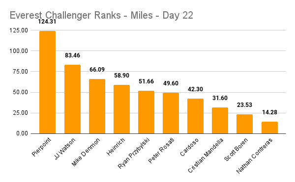 I posted yesterday that the leader in miles rucked had commented that he would be taking over on steps (stairs) climbed as soon as he got home from where he was at currently. He didn’t have stairs to climb, so he has essentially posted zero steps (stairs) climbed so far.