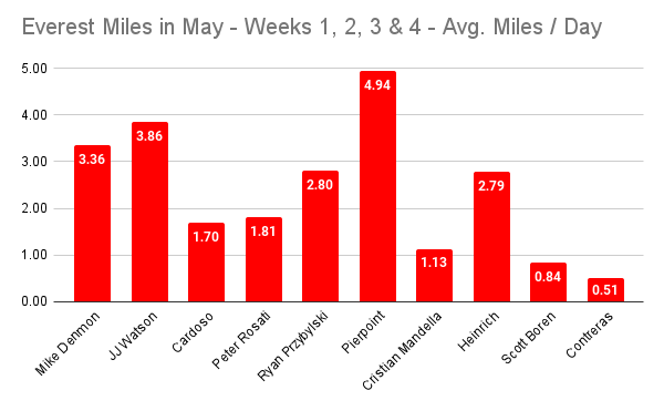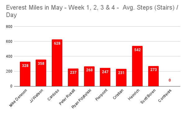 No change in either leaderboard (rucking or steps(stairs)) from Week 3 to Week 4. I am hoping that we can bypass 100K steps (stairs) in the next three days, and 750 miles.
