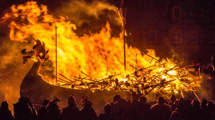 A boat being burned at the Up Helly Aa festival in the Shetland Islands,